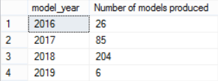 SELECT model_year,COUNT(product_name) [Number of models produced]